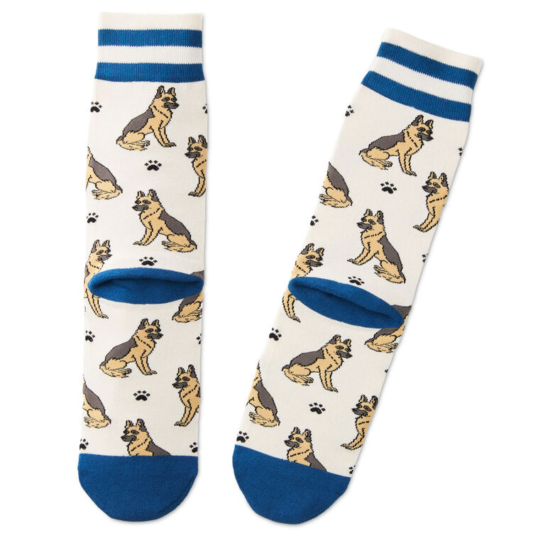 Herd your tootsies into a fashionable footwear direction with this cute pair of novelty socks featuring German Shepherd designs. Fun crew socks are decorated with a collage of GSDs and paw prints with navy blue accents on the heels, toes and striped cuffs. These cute socks are sure to be a loyal companion to your feet when you wear them on your dog walks, errands and family gatherings.