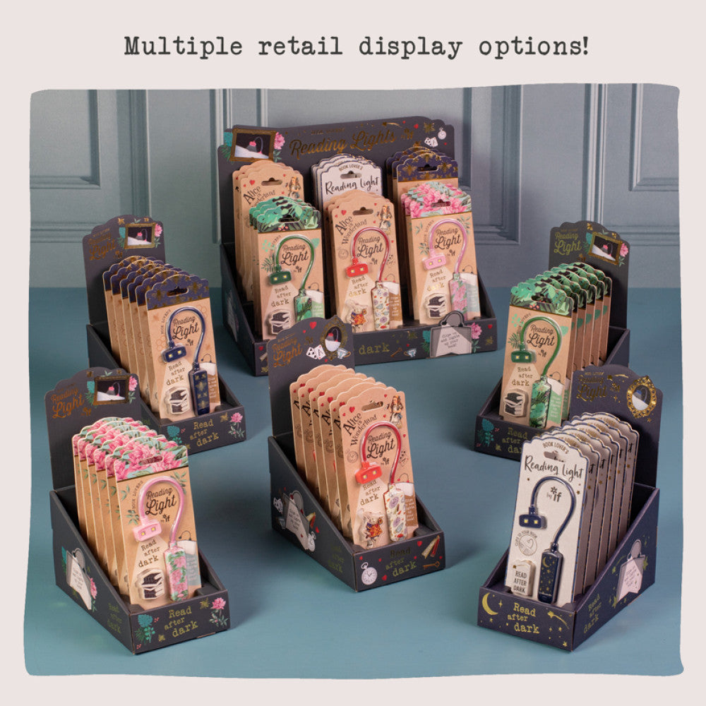 Book lovers are NOT boring! So why should reading lights be dull? Our lovely little pocket sized lights are anything but. Of course they have all the same features that you would expect from a 'proper' book light such as a good battery life, dimmable LED (2 actually) bulbs, a secure clip and bendy positionable neck...just in a much nicer form and giftable packaging. Designed especially to appeal to book lovers who appreciate the finer things in life and like a bit of colour in their reading lives. These will brighten up any store and are a fab unique gift!