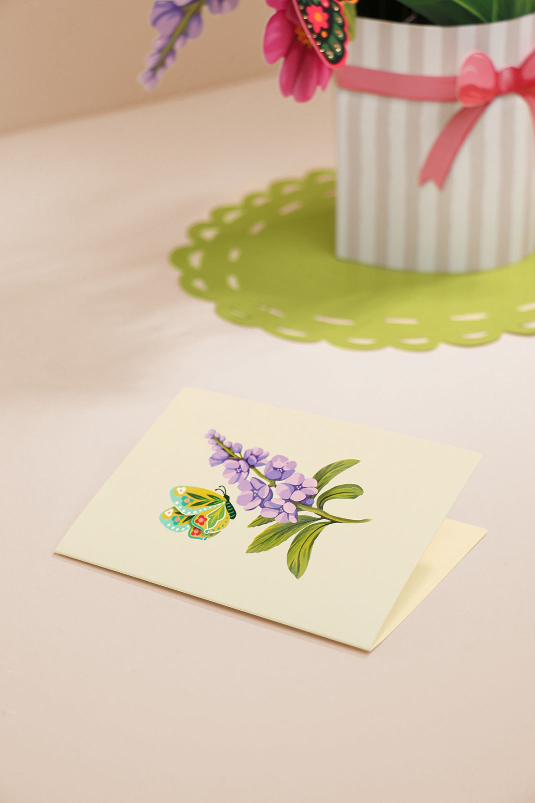 Our Pop-Up Enchanted Garden Bouquet is a whimsical celebration of nature’s magic. This arrangement brings flowers and fluttering butterflies to life. Perfect for adding a touch of wonder and joy to any space or gift, it captures the beauty of a blooming garden in full flight. Includes colorful butterfly stickers with gold foil!