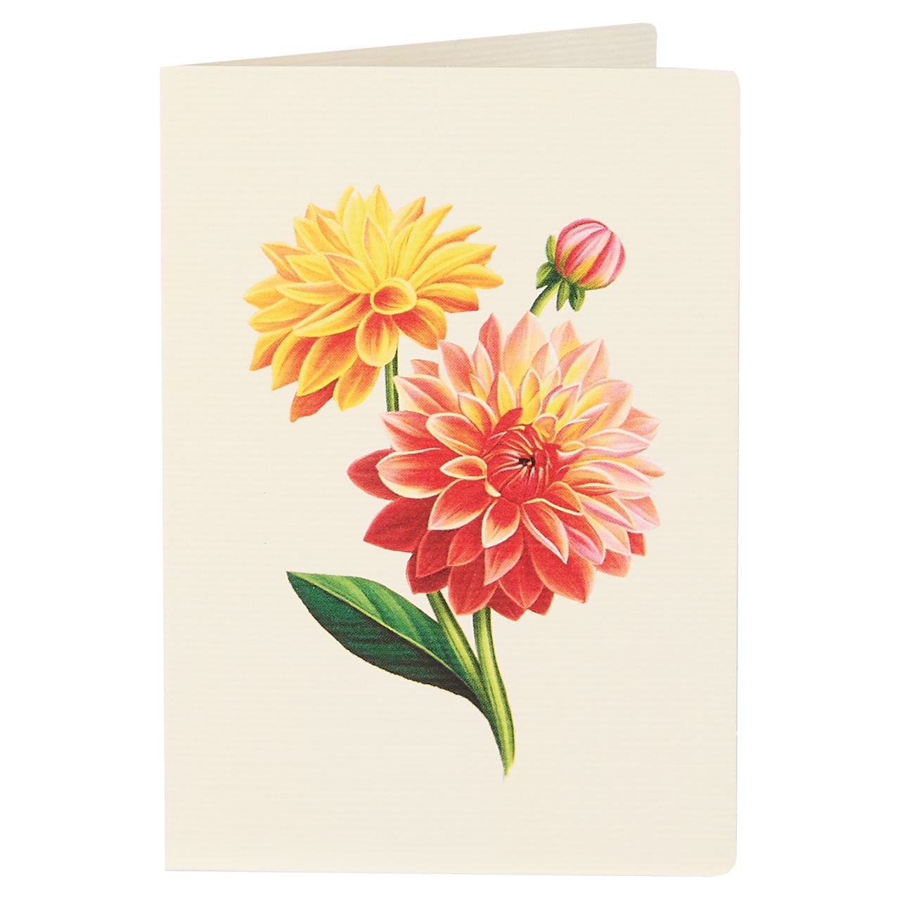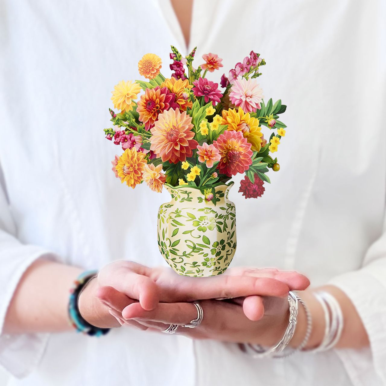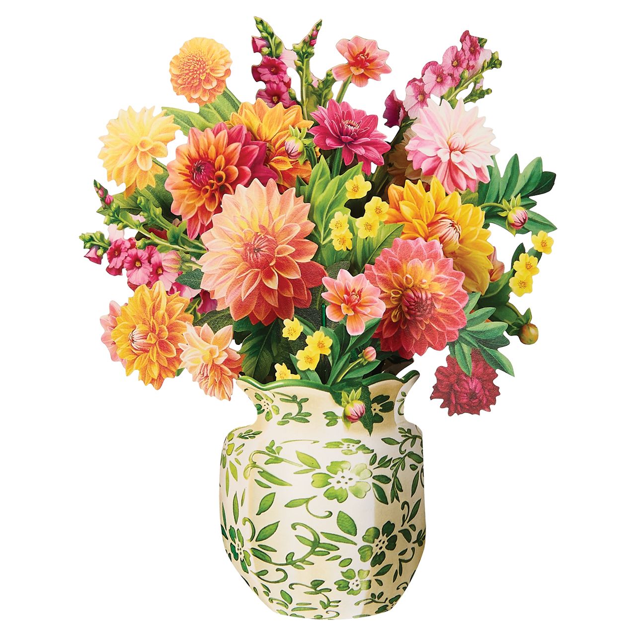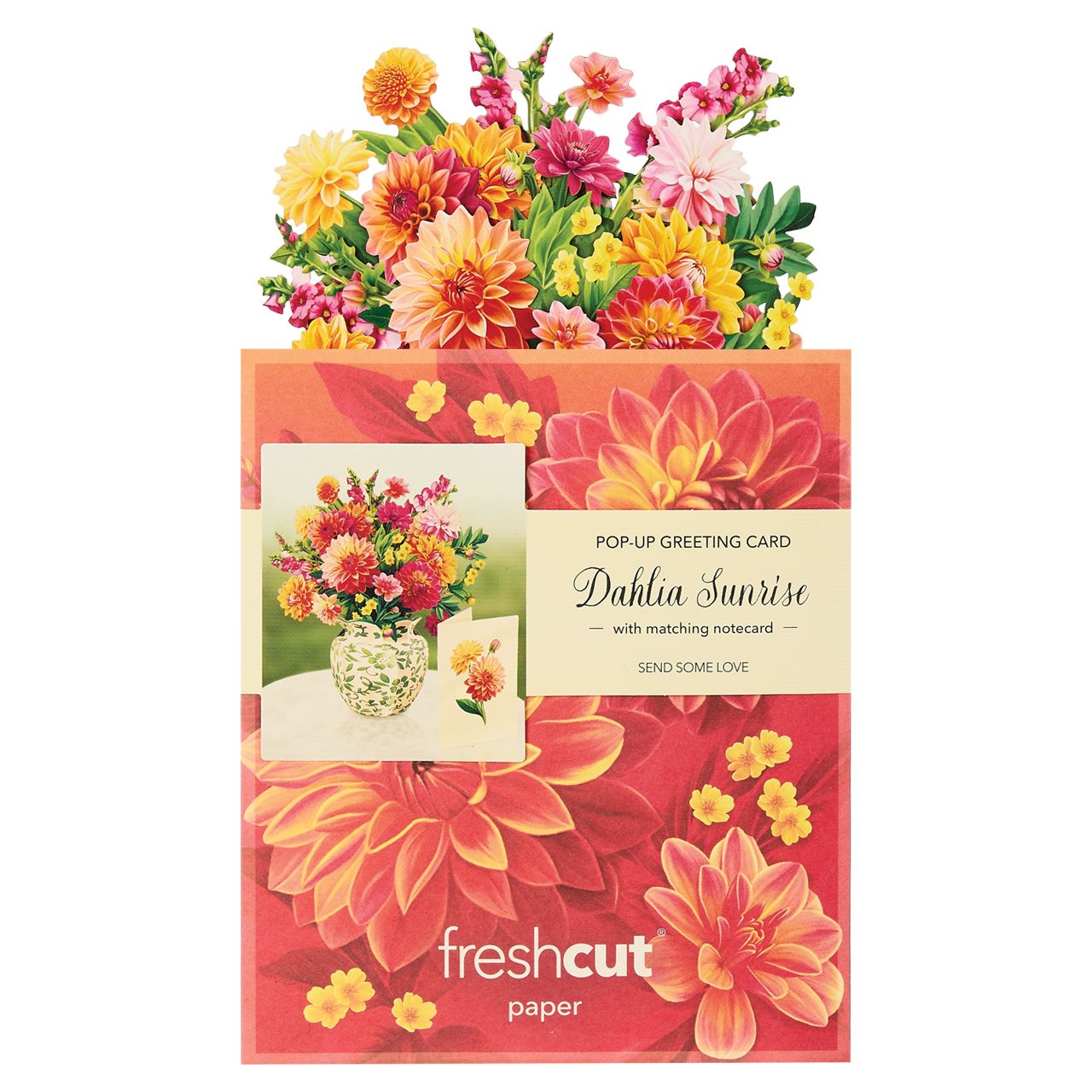 Bring a burst of color to their day with this FreshCut Paper Dahlia Sunrise Pop-Up Greeting Card. This radiant bouquet captures the beauty of a summer garden at dawn, with layers of pink, coral, yellow, and orange dahlias in full bloom. Displayed in an elegant patterned vase, this 3D pop-up arrangement makes a stunning keepsake that will brighten any room-no watering required.