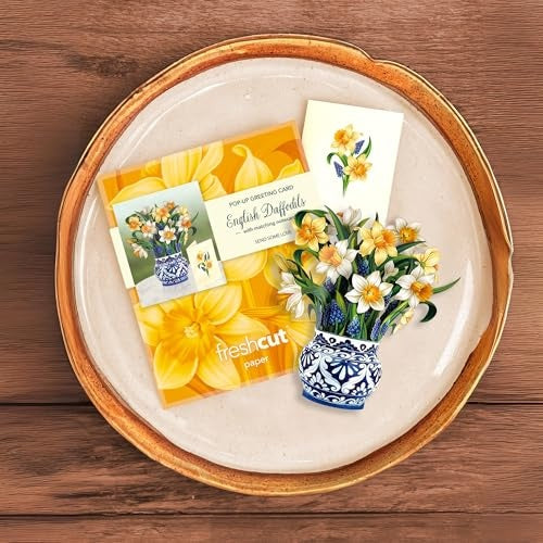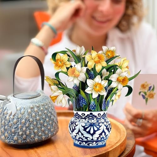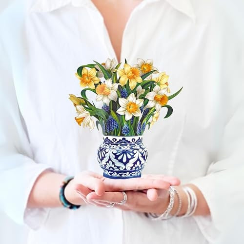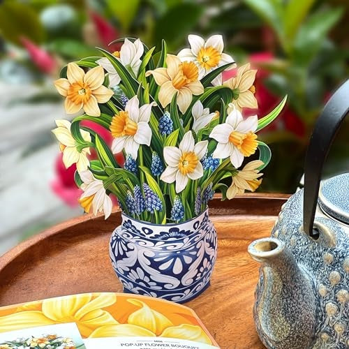 Our mini pop-up bouquet of English Daffodils features a delightful assortment of grape hyacinth buds and yellow and cream daffodil blossoms! Abundant in gardens across the English countryside, this charming classic is a symbol of hope, healing, and fresh beginnings Presented in an ornate paper vase inspired by English earthenware, this elegant gesture is perfect for all occasions. Easy to care for and long-lasting, these forever flowers will continue to cheer on your special someone for many years to come.