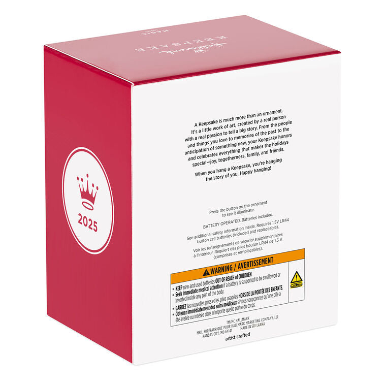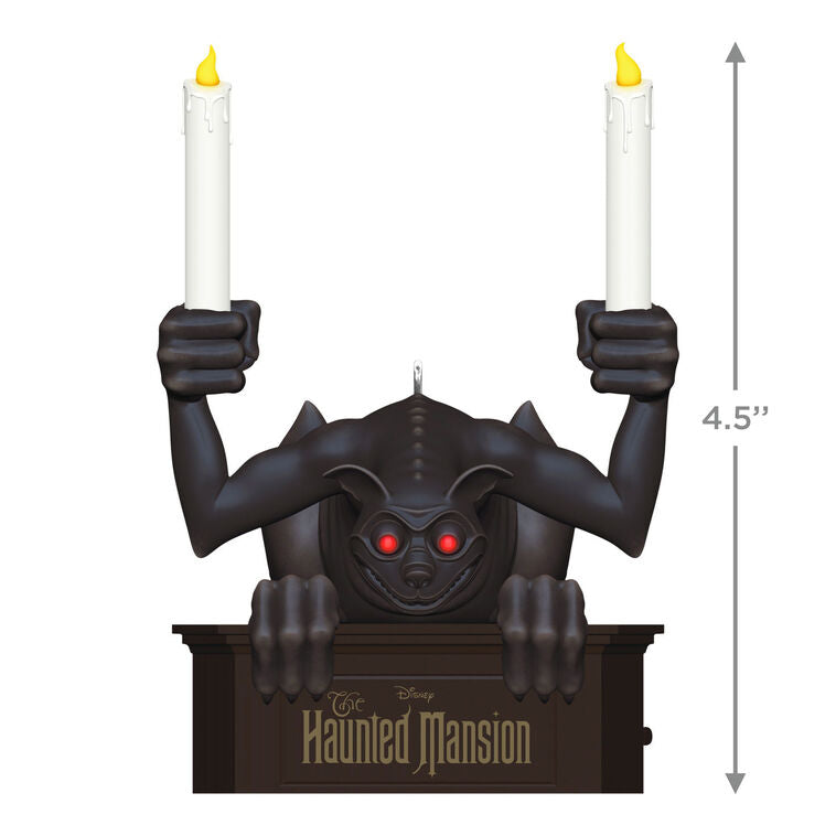 Add an aura of foreboding to your holidays with this Disney The Haunted Mansion Gargoyle Christmas tree ornament. The iconic candleholder design comes to life at the push of a button, as the eyes glow red and the candles flicker. Battery operated.