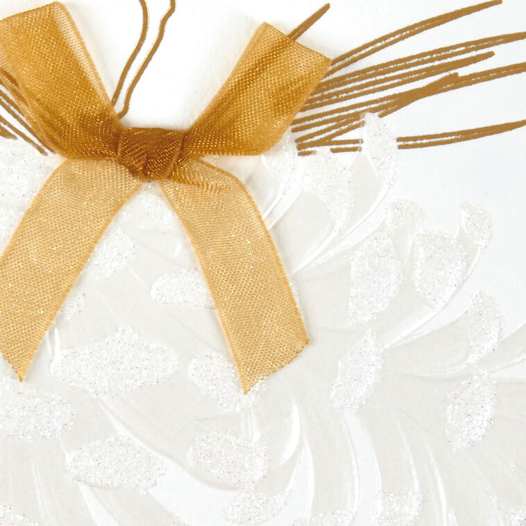 Boxed Christmas cards feature a pair of glittery, embossed pinecones highlighted with gold foil greenery and a coordinating gold organza ribbon bow. This multipack of holiday cards is perfect for sending season's greetings to friends, family and loved ones. Includes 12 cards and 12 designed, self-sealing envelopes.