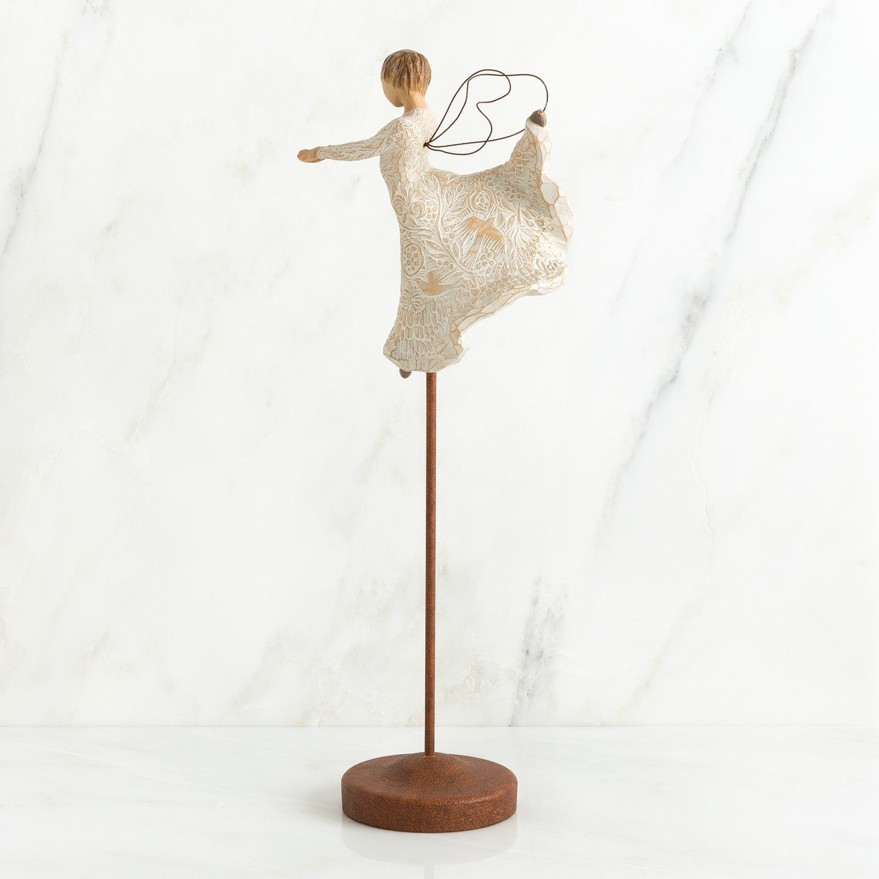 • Elevated angel in cream dress with full skirt and wire wings, in ballet pose with outstretched arms. Nature symbols carved on dress