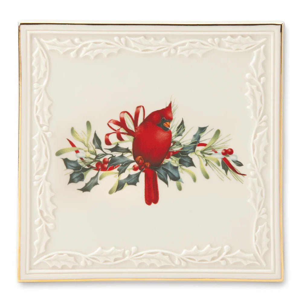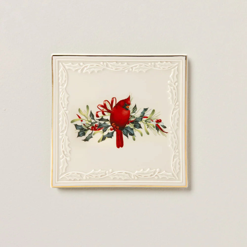 Rest hot dishes on this expertly crafted porcelain trivet. Our classic Winter Greetings pattern features a friendly cardinal perched on a twig decorated with a bright red ribbon. 24-karat gold accents shimmer along the border to make the piece a charming addition to your holiday table.