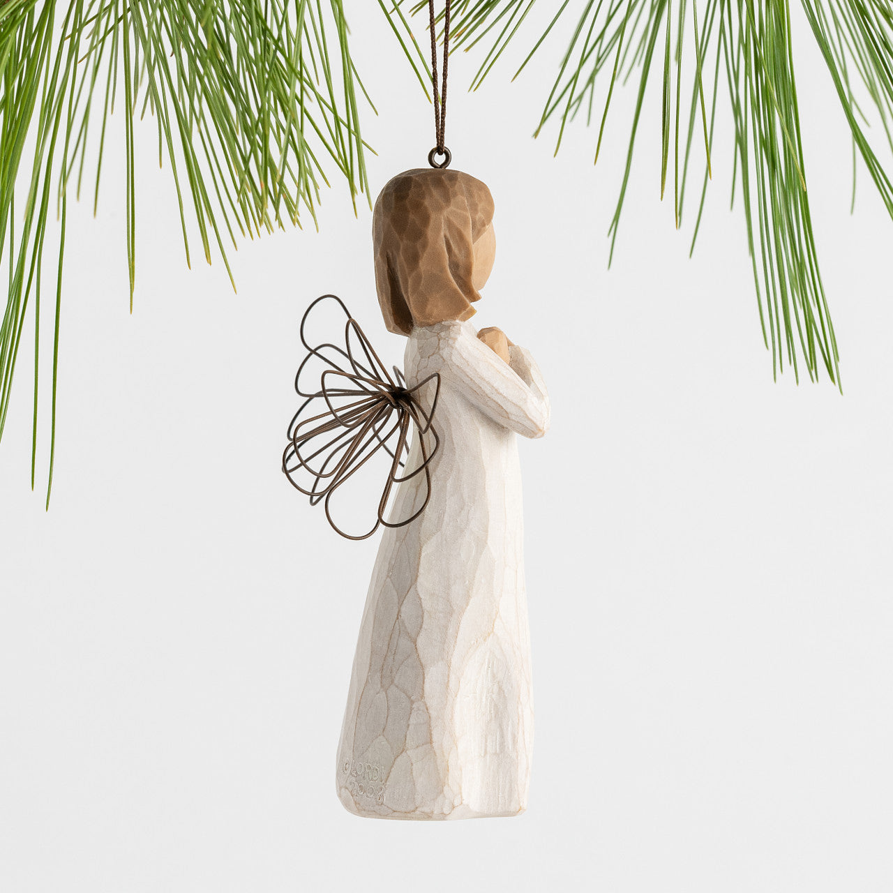• Angel in cream dress with wire wings, with arms crossed in front of chest in International Sign Language for love. Hook and loop affixed to figure's head