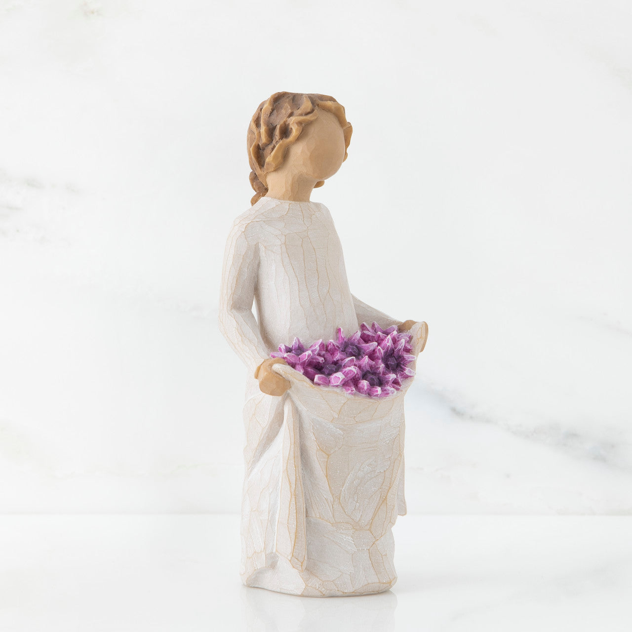 • Standing figure in cream dress, holding up skirt filled with purple daisies