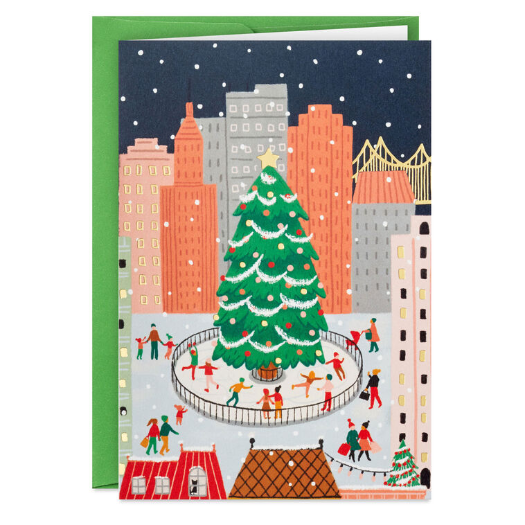 Christmas card pack features a heartwarming scene of ice skaters against a towering skyline set with a giant Christmas tree with shimmering gold foil accents. Our convenient pick-a-pack sets of five Christmas cards make it easy to mix, match and share happy holiday wishes with all your family and friends. Includes 5 cards and 5 self-sealing envelopes.