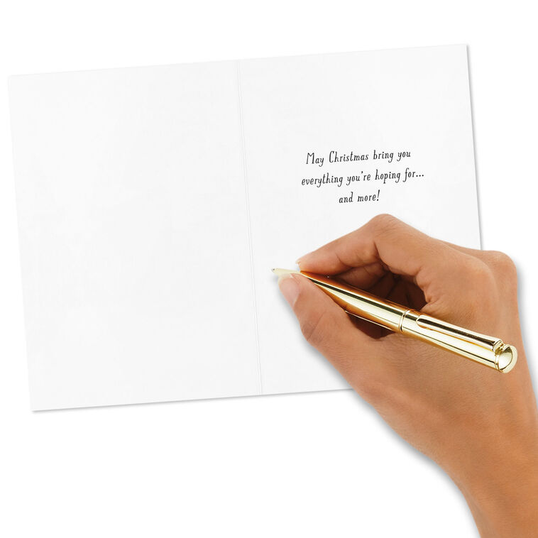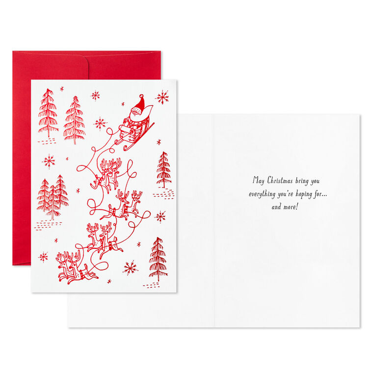 Christmas card pack features a cheerful red foil design of eight reindeer pulling Santa in his sleigh among trees and snowflakes on a white background. Our convenient pick-a-pack sets of five Christmas cards make it easy to mix, match and share happy holiday wishes with all your family and friends. Includes 5 cards and 5 self-sealing envelopes.