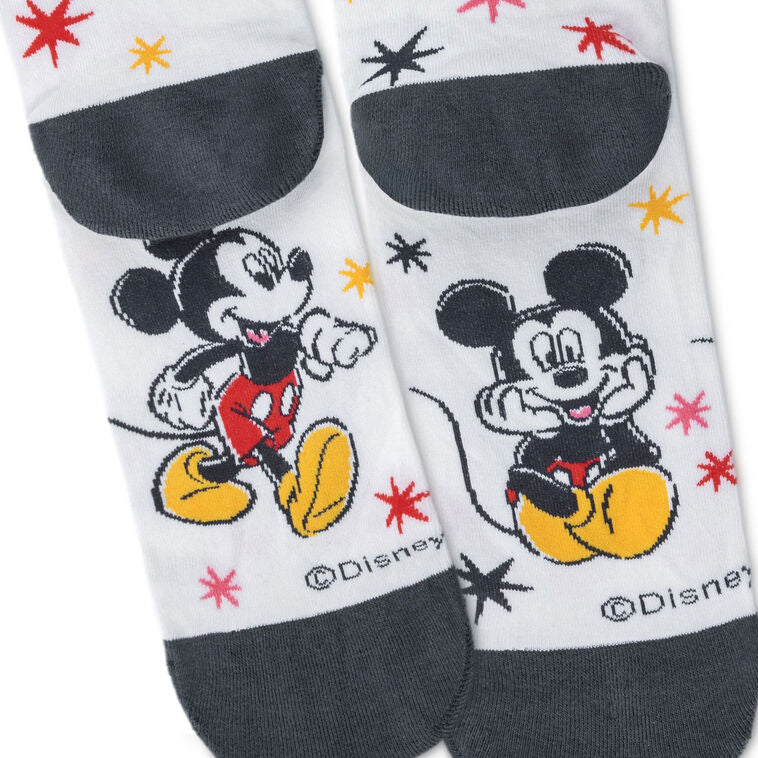 Strut your stuff with Disney’s Mickey Mouse dancing around your ankles and delighting your fashion sense. These white socks feature illustrated designs of Mickey in strolling, sitting, and standing poses, surrounded by colorful stars in black, red and yellow. Black accents at the cuffs, heels, and toes add a touch of cheeky sophistication. Sized for adults, this pair of Disney novelty socks makes a fun addition to your own collection or a charming gift for any Mickey Mouse fan.