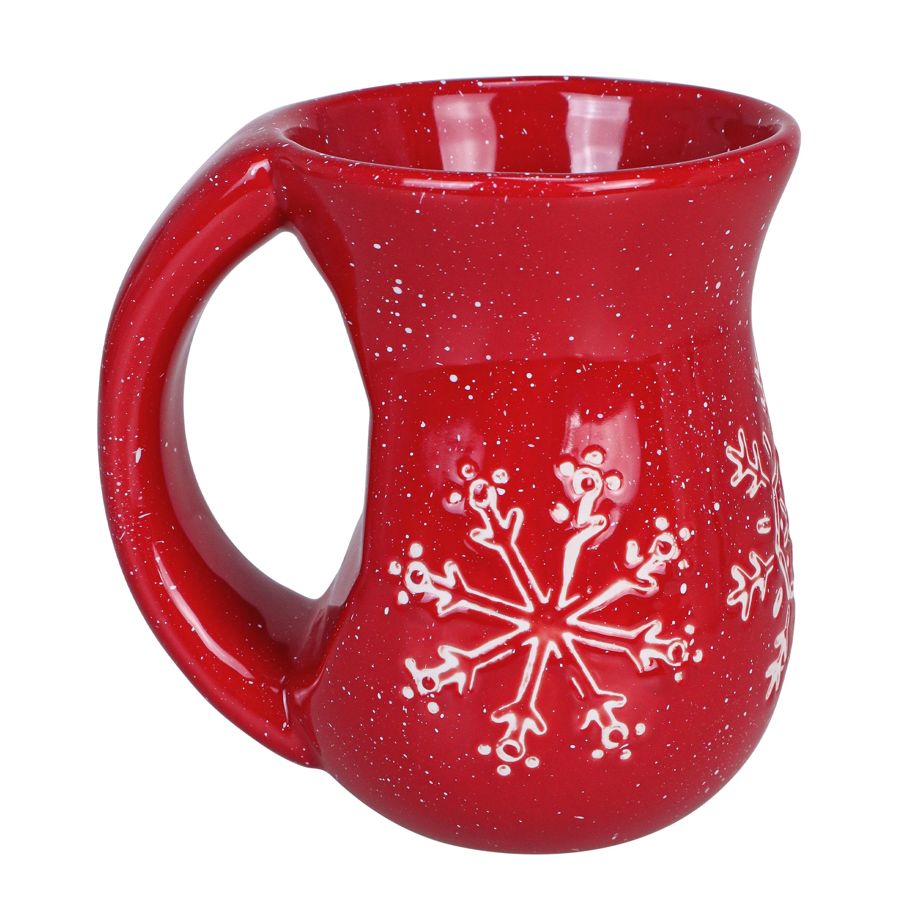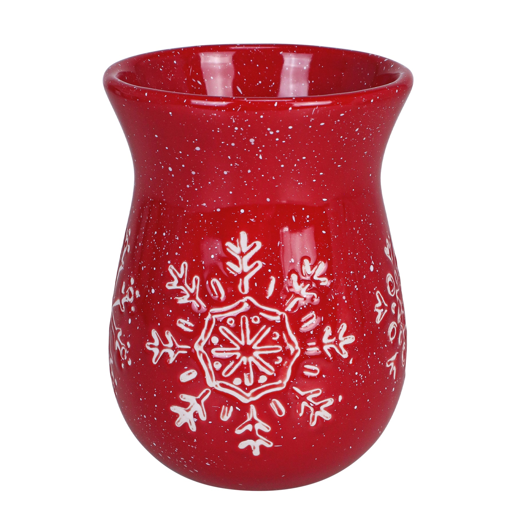 Wrap your hands around the warmth of winter with this bold cranberry red mug, decorated with delicate white snowflakes. A holiday staple for sipping in style.