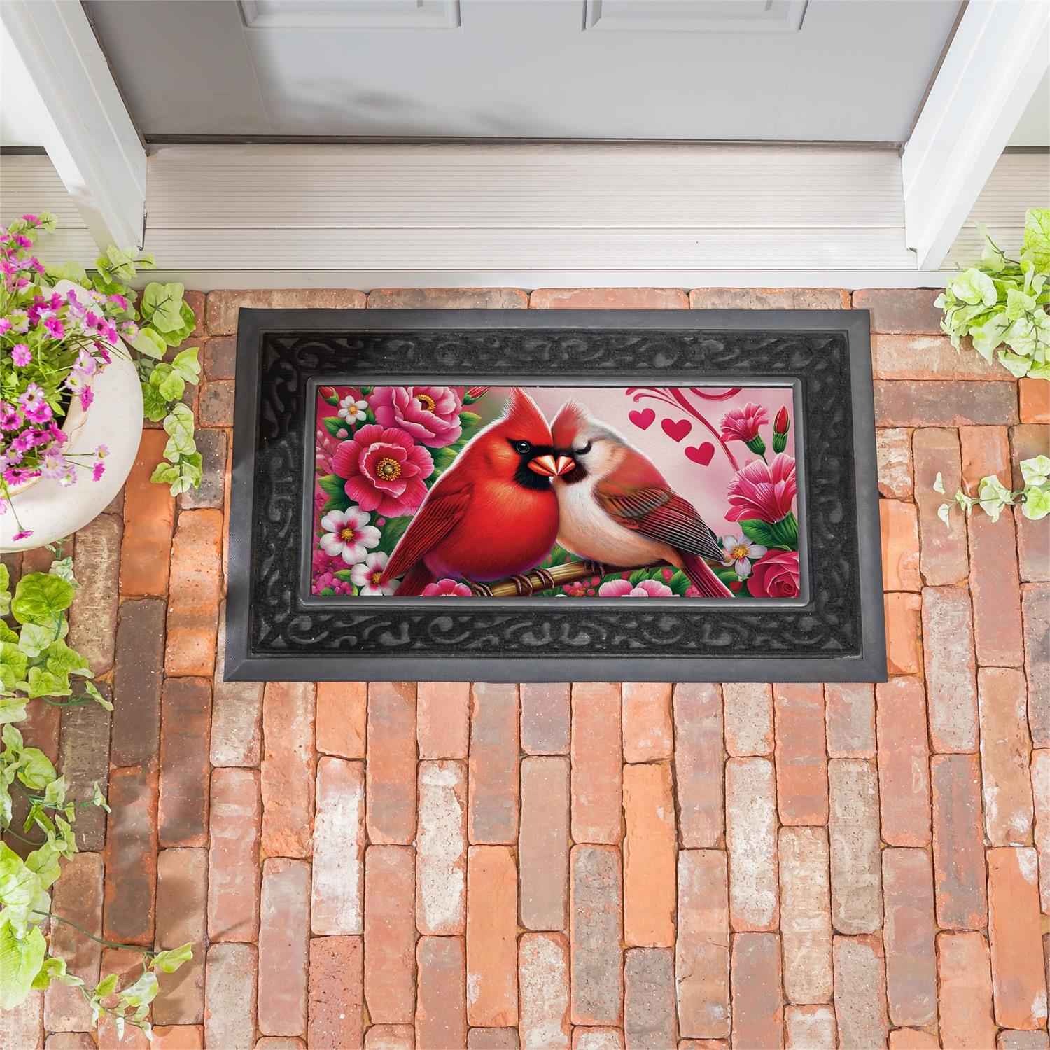 Sweep guests off their feet with our beautifully made Sassafras mats! Made with bright pops of color that are perfect for the season, this mat will put pep in anyone's step. Crafted from heat-sublimated polyester with a rubber backing, this versatile mat is designed to fit perfectly within Evergreen's switch doormat bases. The mildew resistant mat is ideal for indoor or outdoor use and features a skid-resistant backing to help keep it in place. This welcoming mat will freshen up your stoop season after season while ensuring your home stays debris-free. For stains, simply spot clean with soap and warm water.