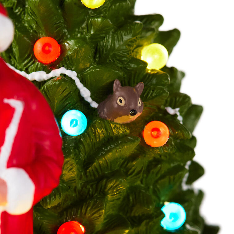 Have the hap-hap-happiest Christmas ever with this hilarious figurine of Clark Griswold ready to sleigh the holidays. The light-up figurine displays Clark in a Santa suit clutching his trusty moose mug and standing by a scorched armchair. A smoky cat outline in the carpet and his too-tall tree curving candy cane-style behind him complete the epic scene. Press the button on the figurine's base to see the tree lights illuminate, the singed cat outline glow and hear one of seven quotes from the laugh-out-loud classic "National Lampoon's Christmas Vacation."