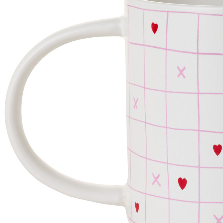 • White mug features a pink grid pattern with X and heart designs, an oversized handle and a recessed base for stacking.
