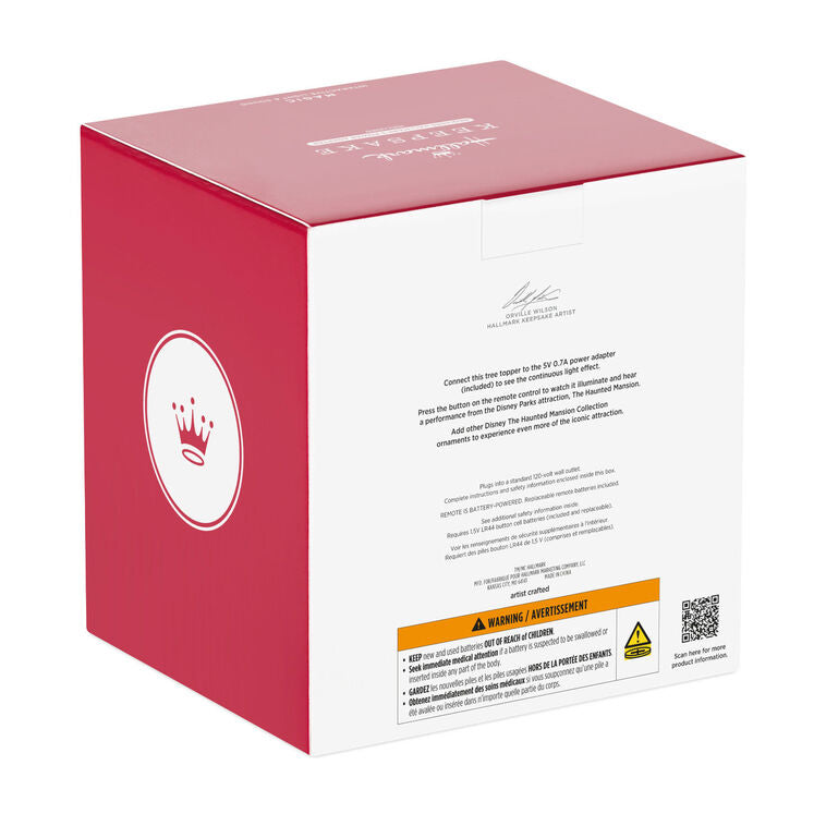Relive the fun of a visit to the Disney Parks right on your Christmas tree with the Disney The Haunted Mansion tree topper that features music and dialogue from the beloved attraction. Plug it into the included power adapter for constant illumination, then press the button on the included remote control to start a synchronized sound and light show. Connect one or more of The Haunted Mansion Collection ornaments—Madame Leota, Victor Geist, The Coffin in the Conservatory, Constance Hatchaway, The Caretaker and His Dog, The Singing Busts, The Opera Singers, and The Hitchhiking Ghosts (each sold separately)—to unlock additional performances that you can't access with the ornaments alone! We think you'll agree these happy haunts deserve a place in the dead center of your holiday decor.