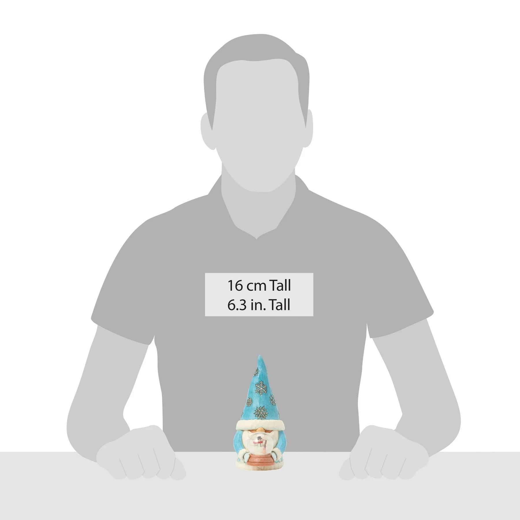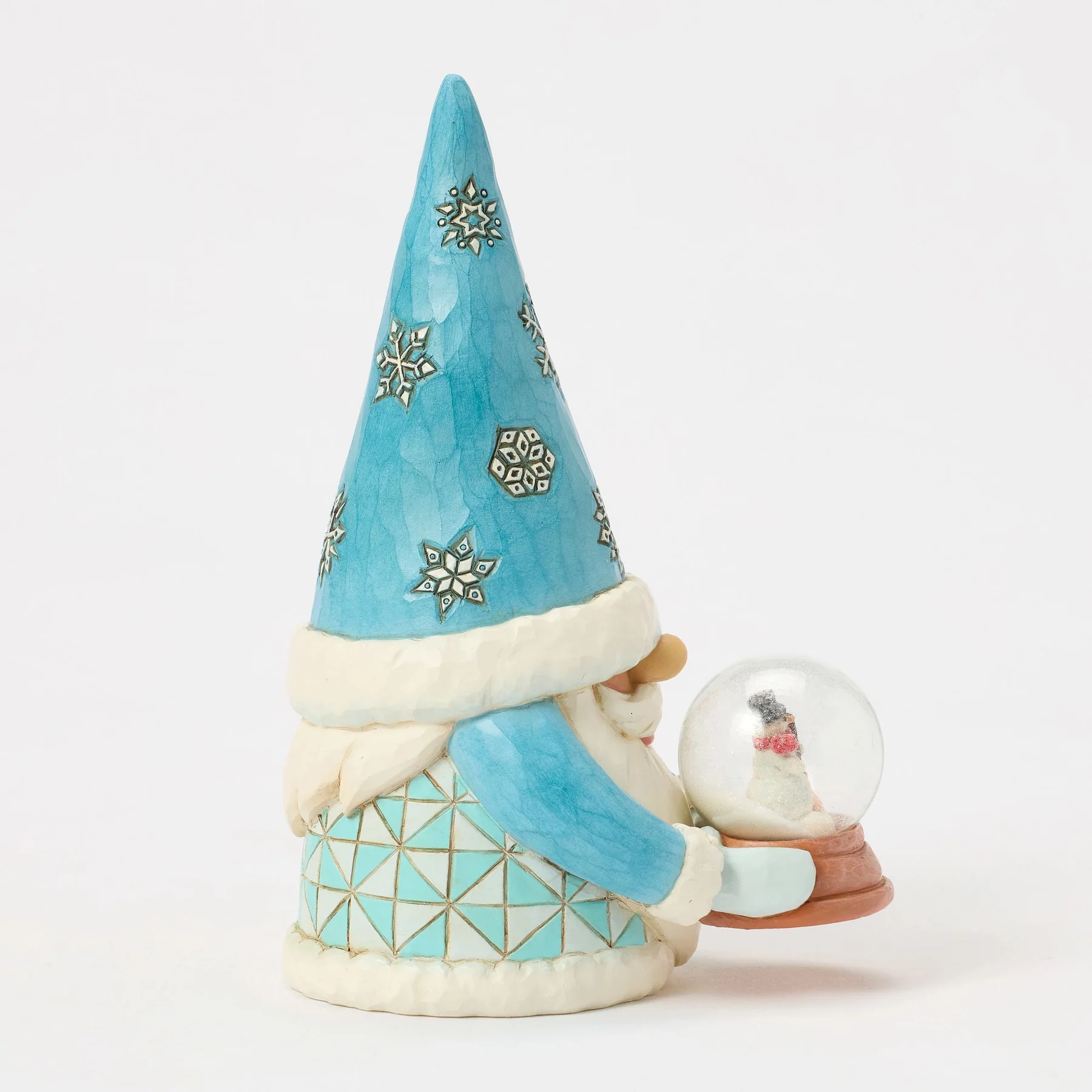 This Jim Shore Christmas gnome delights with winter wonder in a snowflake-patterned hat. He carries a charming glass dry snow globe of a miniature snowman scene that captures the magic of the season, adding a whimsical and cozy touch to your holiday