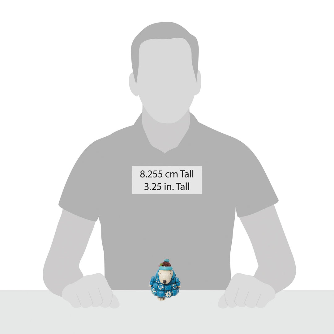 Bundled in an oversized blue puffer coat, this hilarious Peanuts miniature features a very prepared Snoopy. Buried in the bulk of the coat, the dog wears a pleased expression, warm in his masses of patterned fabric. This Jim Shore bust is a charmer.