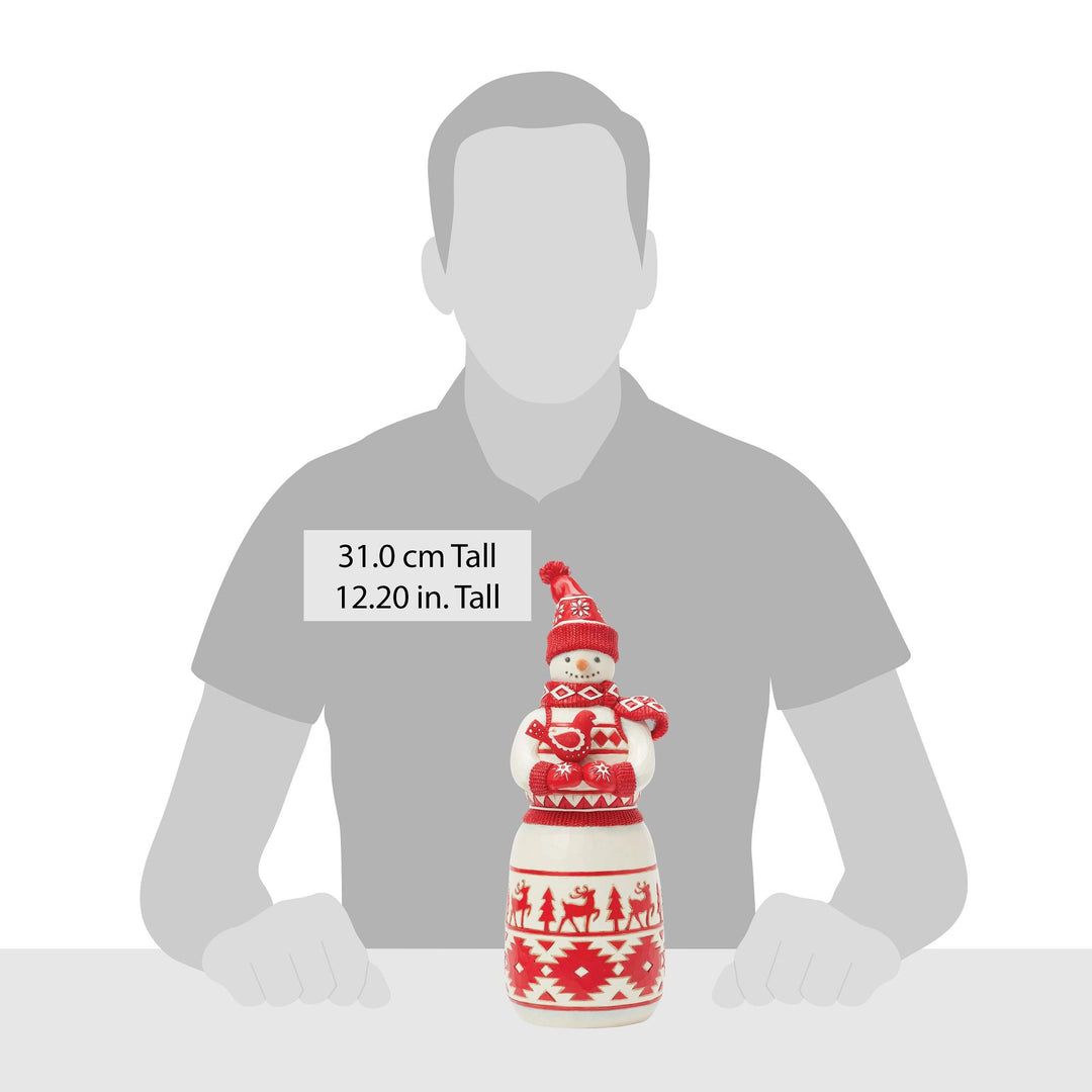 This sweet Jim Shore Nordic Noel snowman features bold red Nordic-inspired patterns, on his body, gloves, cozy scarf, and knitted hat. Holding a delicate cardinal bird in his hands, the snowman boasts whimsical trees and reindeer with a loving smile.