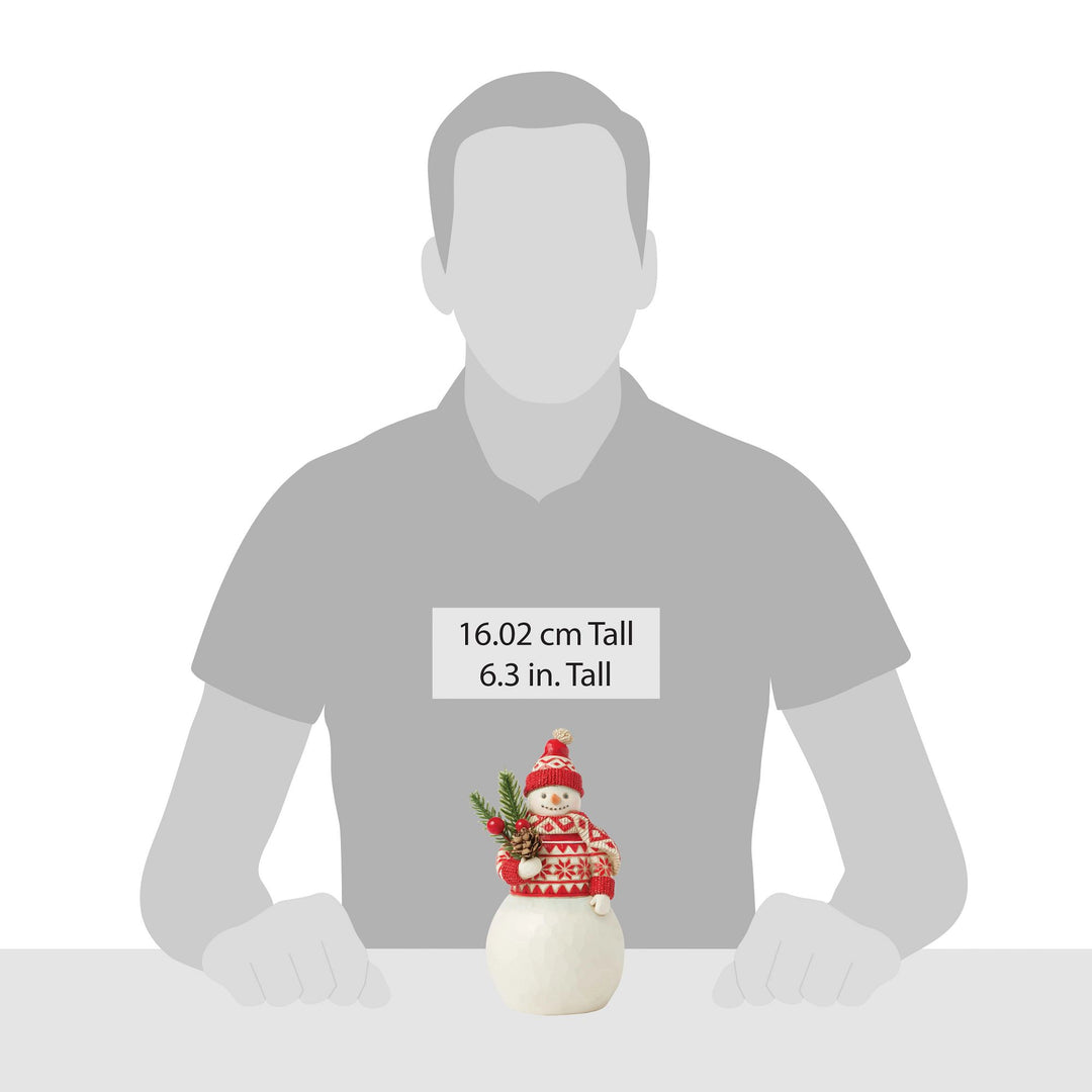 This cheerful Jim Shore Nordic Noel snowman is dressed in an intricately patterned red Nordic sweater, scarf, and hat, radiating warmth and holiday spirit. With a bright smile, he holds a fresh evergreen sprig in his hands, eagerly embracing the joys of
