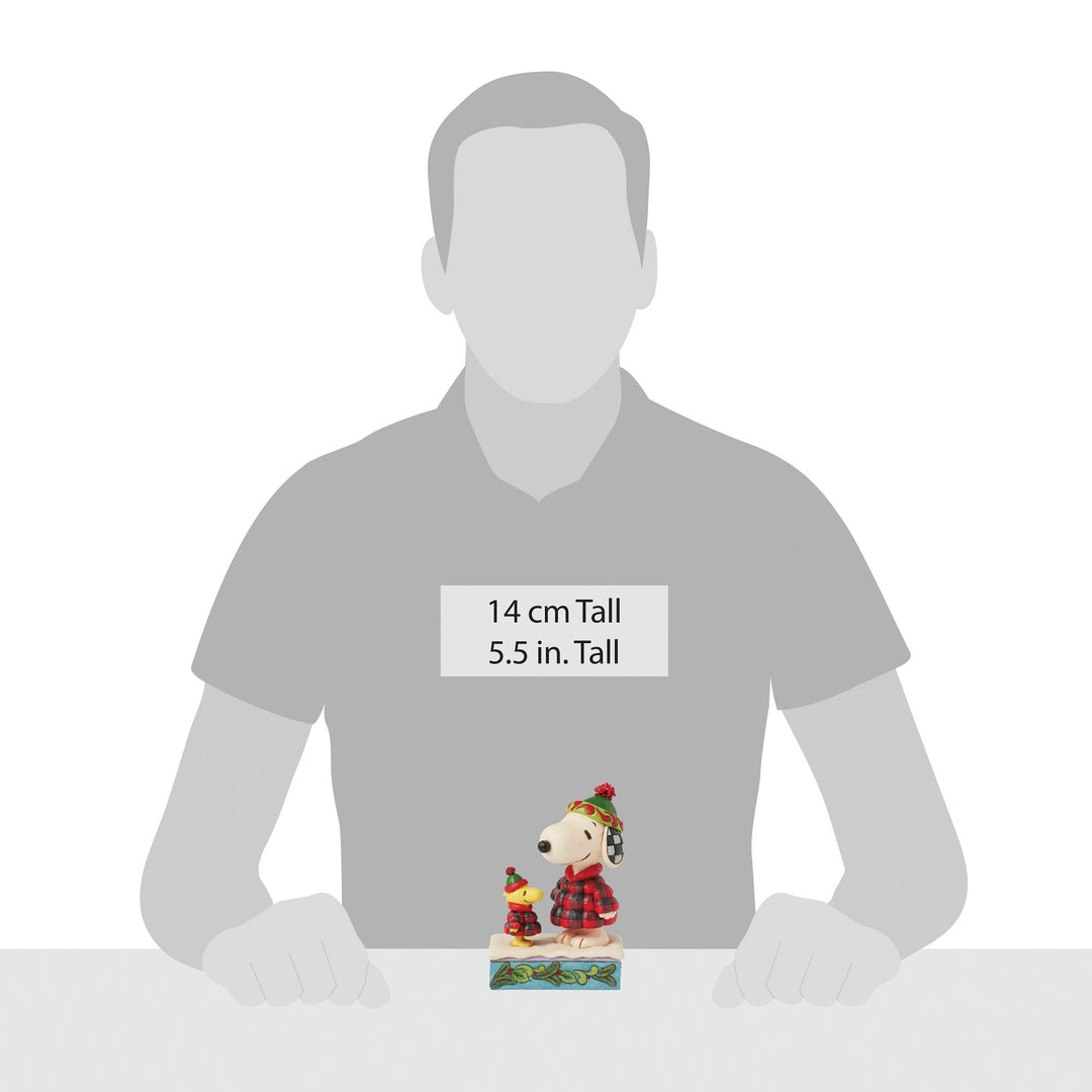Celebrate the winter season with this cozy Jim Shore design of Snoopy and Woodstock bundled up in matching puffer jackets. Complete with knit caps, they delight in a snow day with Jim Shore's signature charm and style.