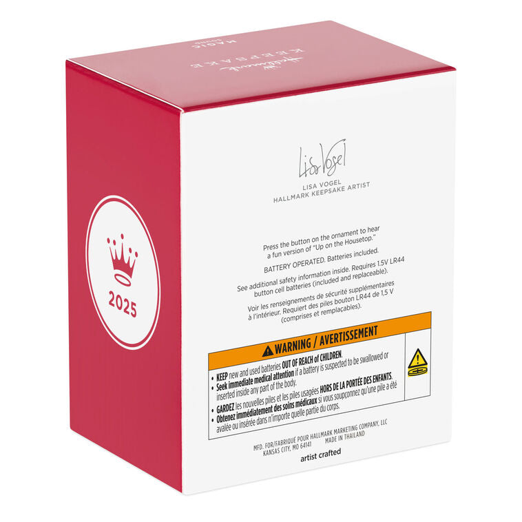 Warm up to wintertime fun with this cute Christmas tree ornament. A pair of snowmen dressed in festive green and red hats stand on a sparkly base around a roaring fire and roast marshmallows together. Press the button to hear a fun musical version of "Up on the Housetop." Battery operated.