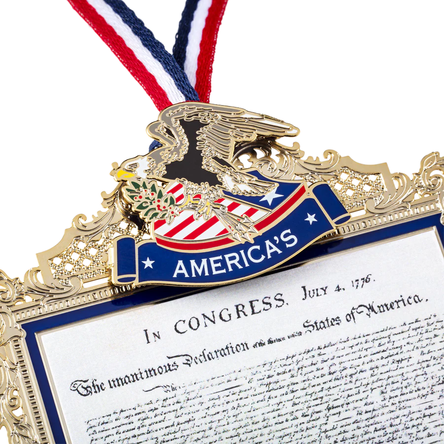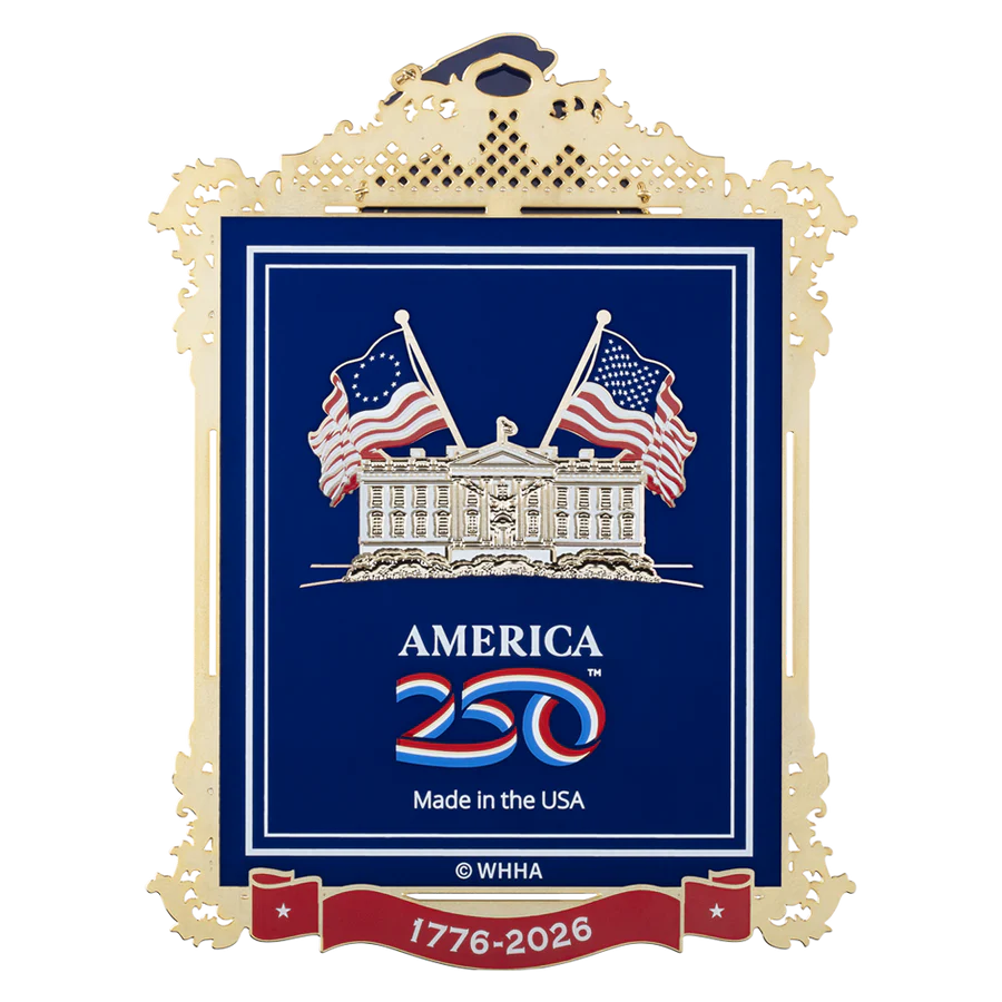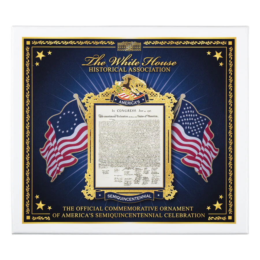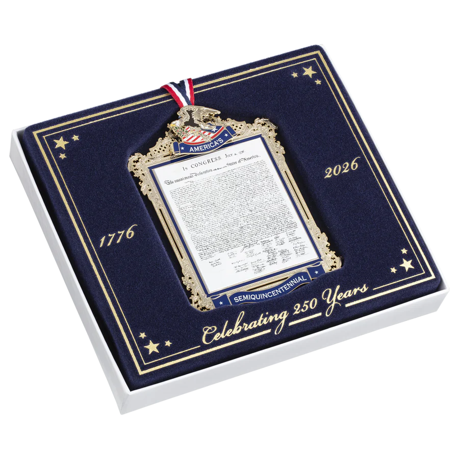 Honor America's 250th milestone with this prestigious Official 2026 Commemorative ornament, an essential collectible for those who cherish our nation's heritage. The front features the Declaration of Independence text elegantly framed and burnished with 24-karat gold for luminous sophistication. The backside reveals an intricately etched White House, attended by both the historic and modern American flags in stately procession. Meticulously designed and hand-assembled in the USA. This ornament transcends typical holiday adornment, destined to become a cherished heirloom passed through generations. Each includes an illustrated keepsake giftbox with gold embossed insert and an informational card.