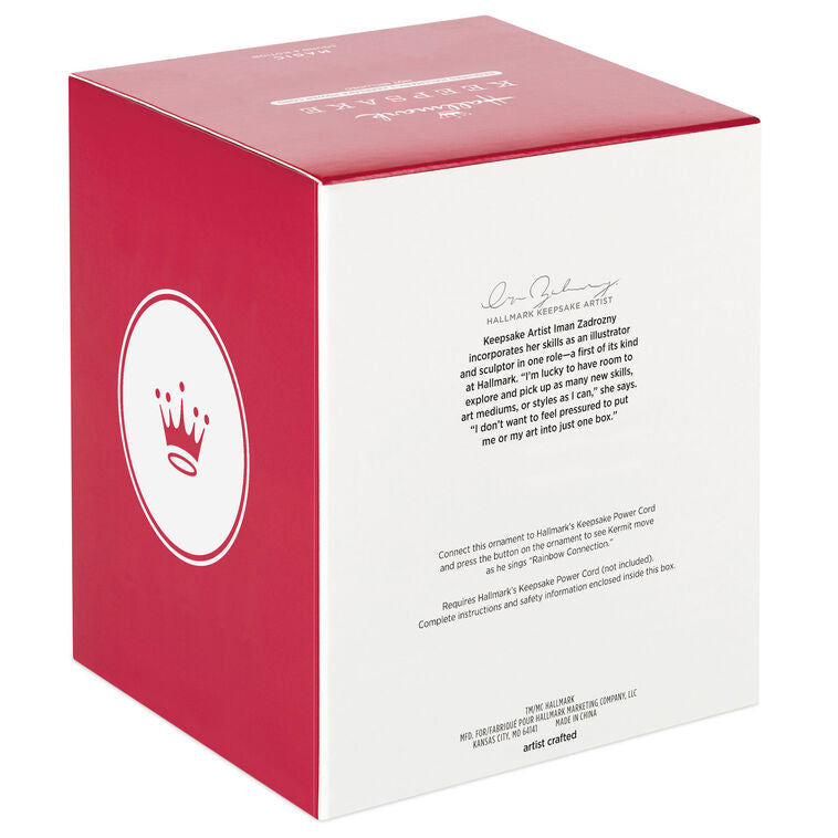 All the lovers, the dreamers and you will want to add this Christmas tree ornament to your collection! Fans of the "The Muppets" will adore this design featuring Kermit the Frog perched on a log holding his banjo. Press the button to watch Kermit move as he sings his iconic song "Rainbow Connection." Requires Hallmark's Keepsake Power Cord (sold separately).