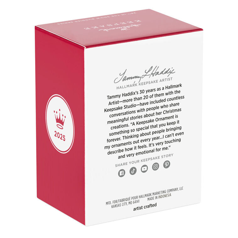 Delight nature and animal lovers with this year's Snow Buddies Christmas tree ornament. Bundled up in a vibrant blue sweater and red scarf, this glittery snowman holds an acorn for a chipmunk friend who's perched in the brim of his purple hat.
