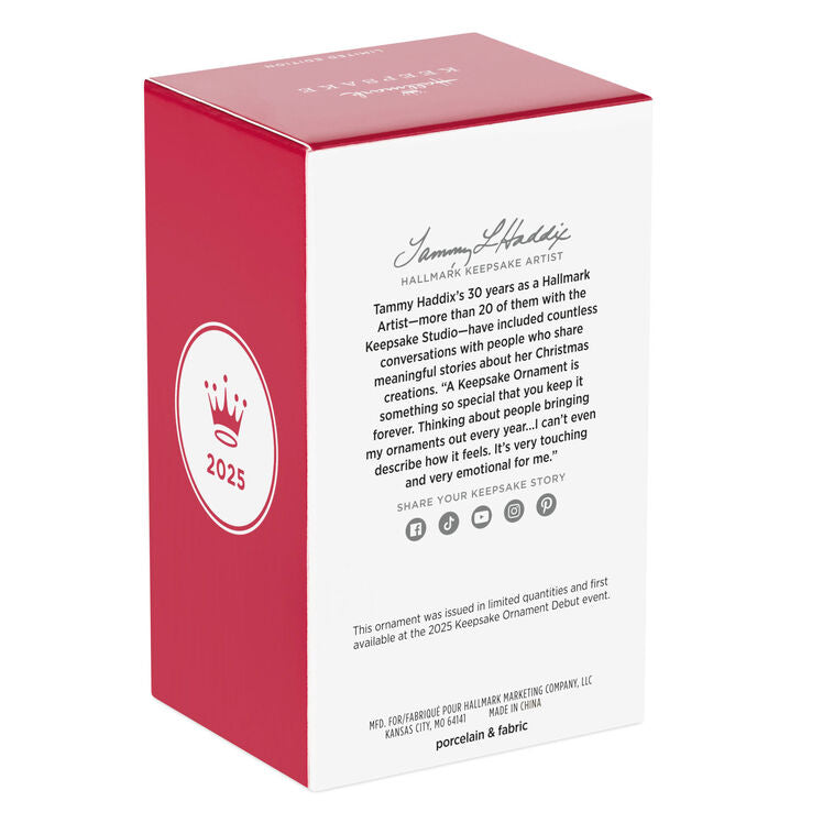 Add a nostalgic touch to your seasonal decor with this sweet Christmas tree ornament inspired by vintage decorations. This classy snow lady with rosy cheeks wears a pretty red bonnet and fluffy white and black muff. The retro-styled decoration makes a heartwarming addition to your holidays. Limited quantities, first available at the 2025 Keepsake Ornament Debut event. Not eligible for Keepsake Wish List.