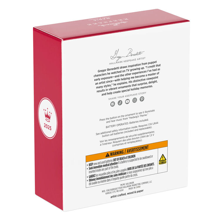 Conjure up enchanted holiday decor for all the Harry Potter fans in your house. This handsome Christmas tree ornament features a dimensional, laser-cut wood frame inspired by castle architecture that showcases a papercraft design of Hogwarts School of Witchcraft and Wizardry. Press the button to see the scene light up and hear music from "Hedwig's Theme." Battery operated.