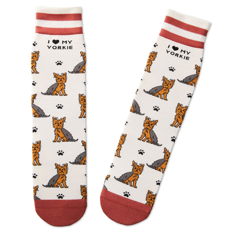 Show friends and family who's boss (your Yorkshire Terrier) with this cute pair of dog socks. Dress fur success when you wear these fun novelty crew socks decorated in a collage of black and tan Yorkies, paw prints and brown accents on the heels, toes and striped cuffs. Unleash your feisty nature with this cute footwear that also makes a great gift for a dog walker, dog sitter or all-around Yorkie fan.
