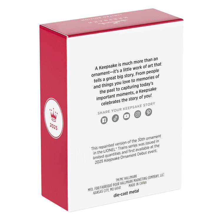 Train aficionados will love adding this Christmas tree ornament to their holiday decor. The Lionel Trains New York Central 700E Hudson locomotive decoration, made of die-cast metal with wheels that turn and a shimmery metallic gold finish, is based on the J1-e world-famous steam engine. Limited quantities, first available at the 2025 Keepsake Ornament Debut event. Not eligible for Keepsake Wish List.