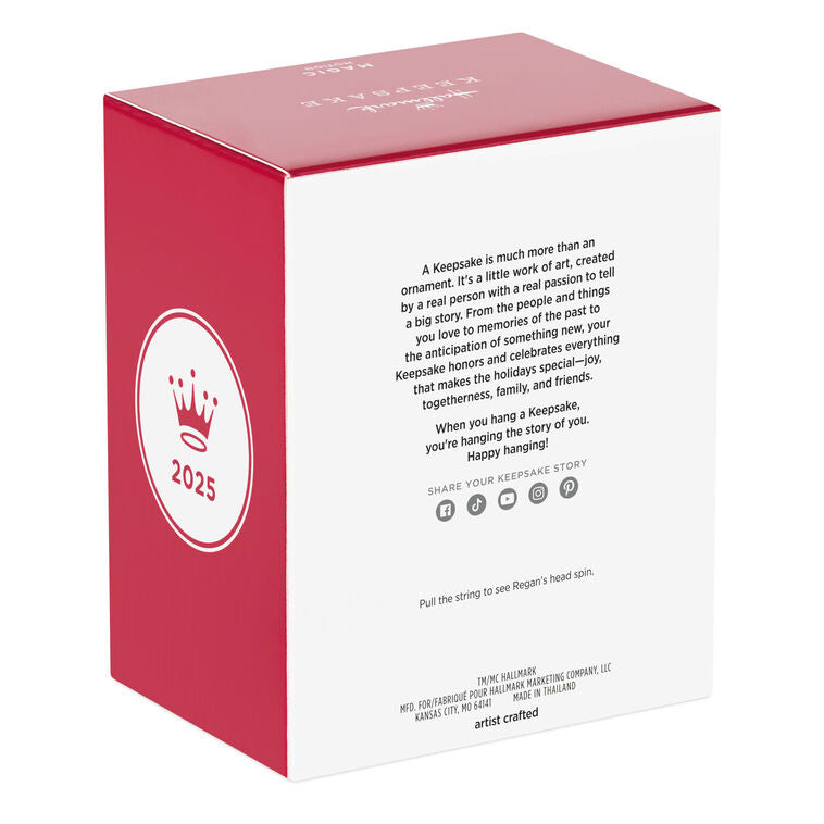 Spread fright and delight to horror film aficionados with this Christmas tree ornament of Regan from "The Exorcist." With signature Funko POP! styling, this spooky ornament features a possessed, scar-faced Regan sitting in a padded four-poster bed. Fans of the iconic scary movie will love the chill they get when they pull the Pazuzu charm to make Regan's head spin. Makes a perfect addition to your Halloween tree or other fall display.