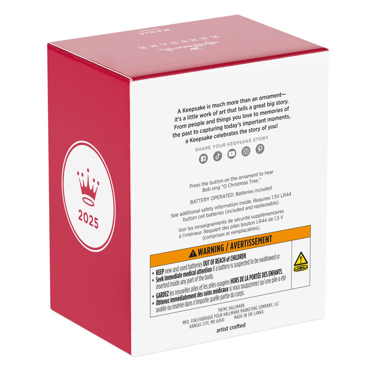 Holding a piece of shiny green tinsel garland, Bob the Minion is ready to trim your tree with holiday cheer. Press the button on this colorful Christmas tree ornament to hear the Minion sing a fun version of "O Christmas Tree." Battery operated.