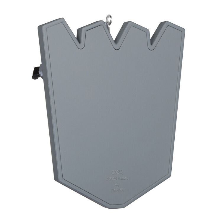 Megatron ornament, Transformers villain, fusion cannon raised, purple Decepticon shield, Hallmark Keepsake, Christmas tree decoration.
