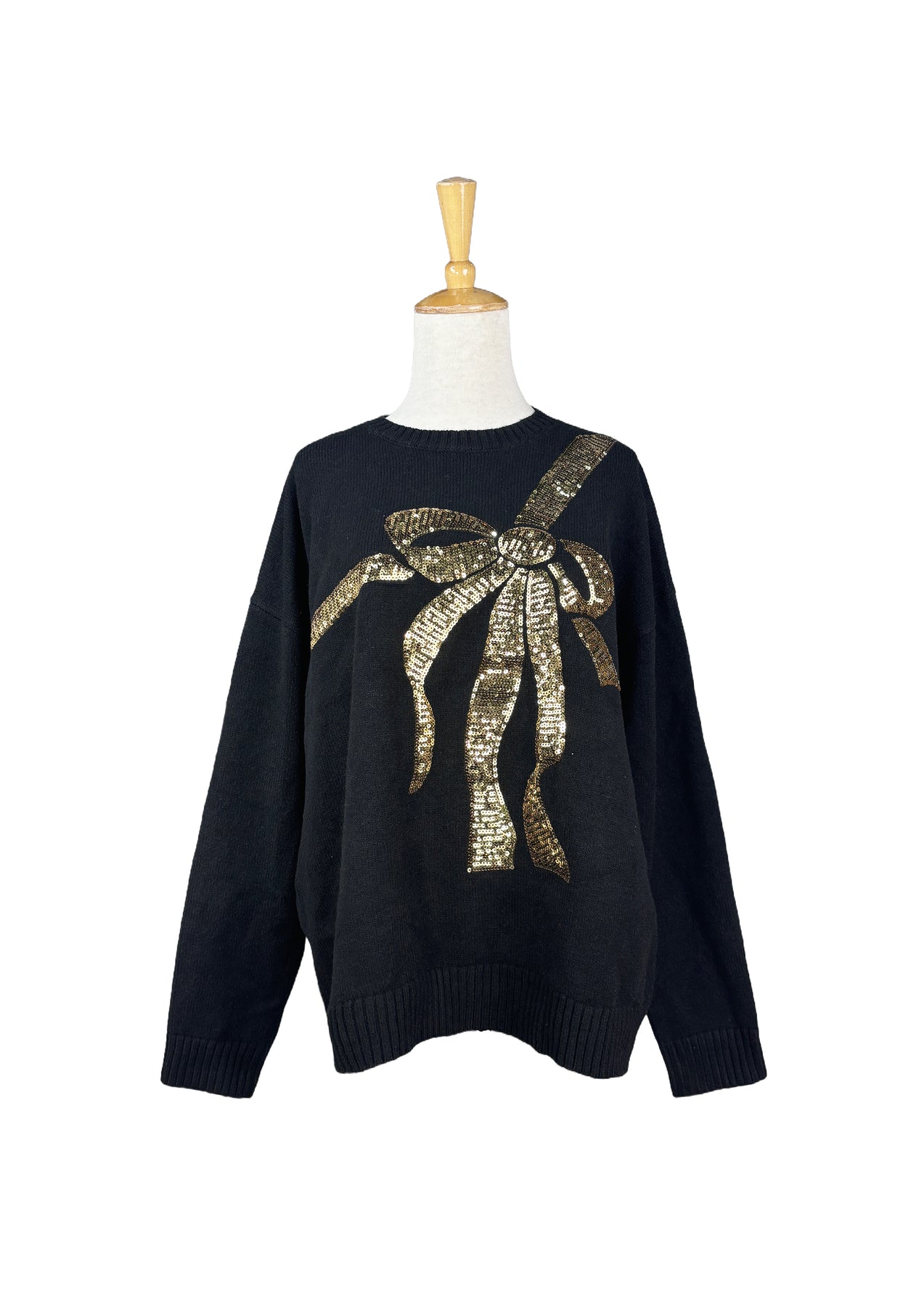 Elegant black knit with gold sequin bow detail