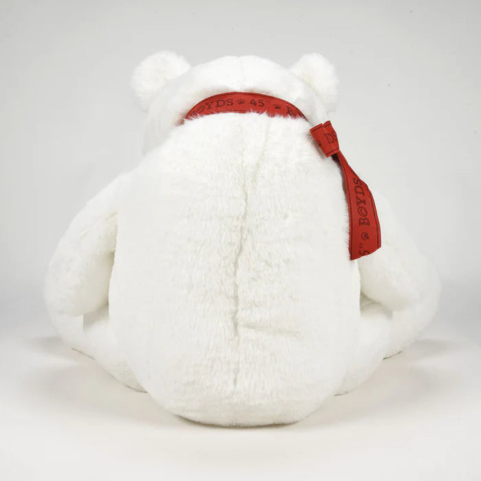 Bubba Pearl is the one polar bear you'll ever come across that you don't have to be afraid of. Although she's a bit shy and prefers keeping to herself, she's always very loyal and caring once you get to know her. You'll often find Pearl with her small circle of friends enjoying deep and meaningful conversations. Once she's maxed out her social battery, she's ready to recharge with some quiet, solo time by going on walks, catching a movie, or even dining alone at a restaurant. Her two siblings are Bubba Bearsevelt and Bubba Amber. As her name implies, Pearl is a white teddy bear with gray pads on her paws. She comes adorned with a commemorative anniversary ribbon around her neck.