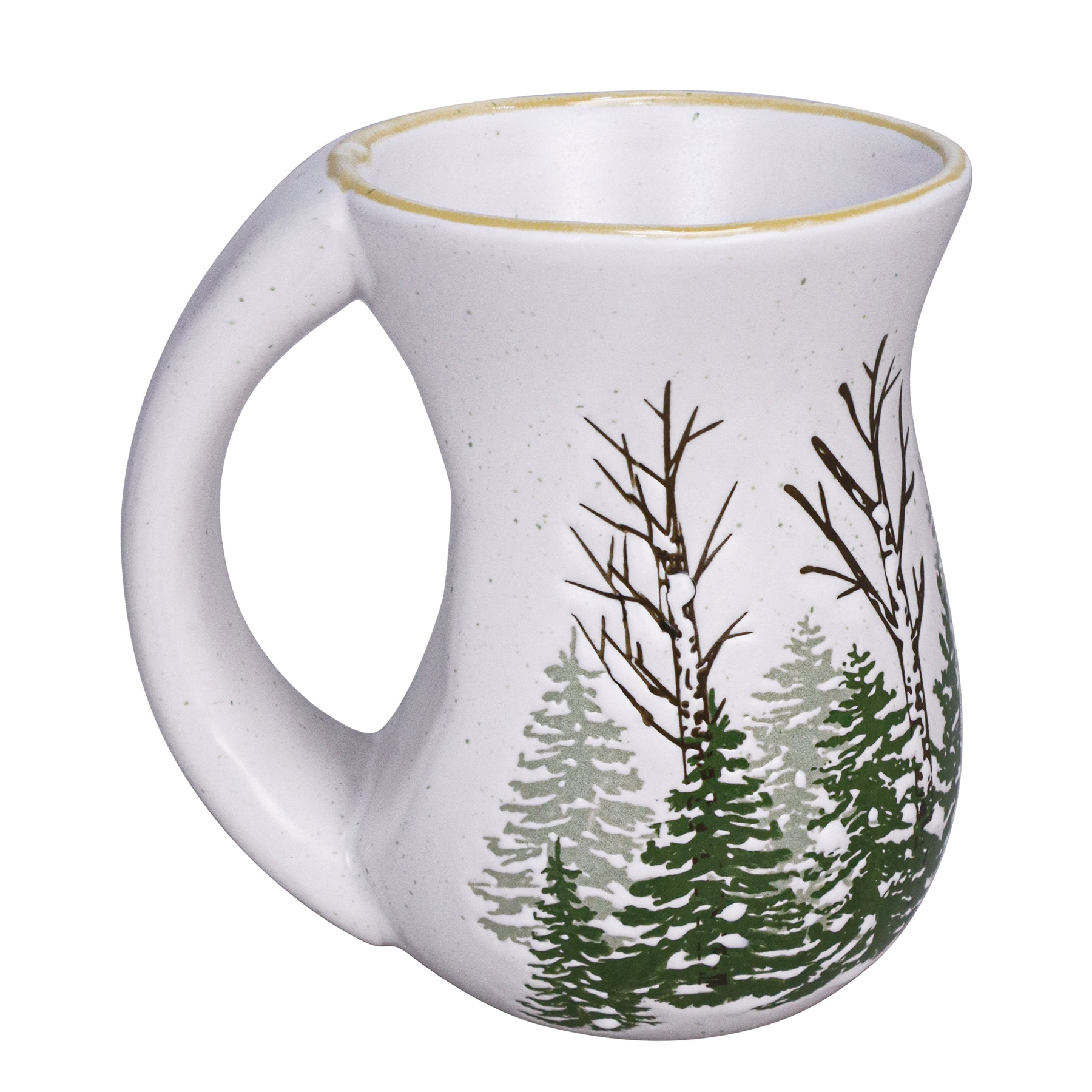 White ceramic mug with balsam and cedar tree artwork and a smiling snowman illustration, curved shape and handle.