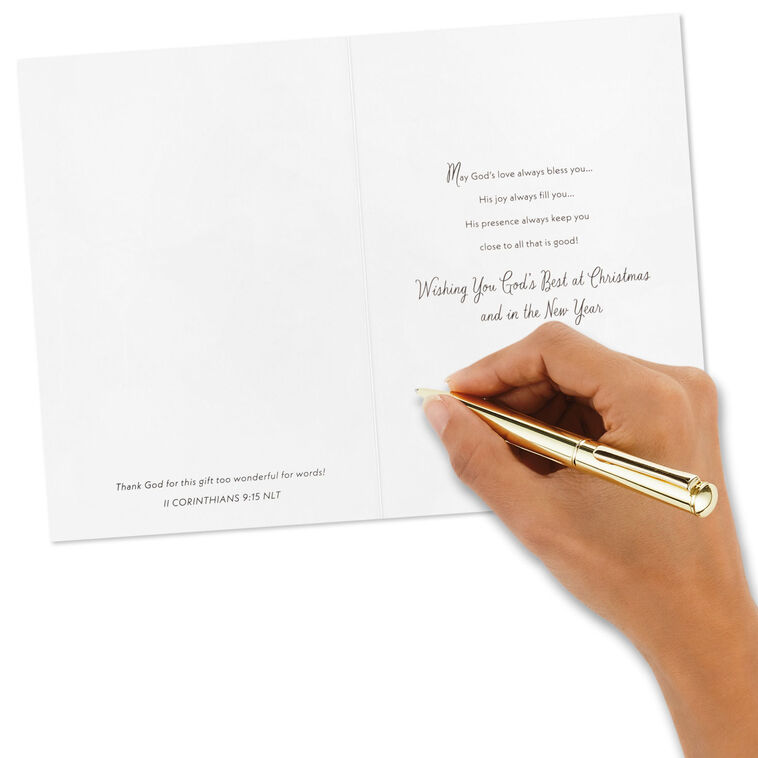 Religious boxed Christmas cards feature a heartfelt illustration of two cardinals and a snowy evergreen with a bright star overhead. A church in the background and iridescent glitter accents add charm. These holiday cards make a great way to share words of faith and joy with friends, family and loved ones. Includes 16 cards and envelopes.