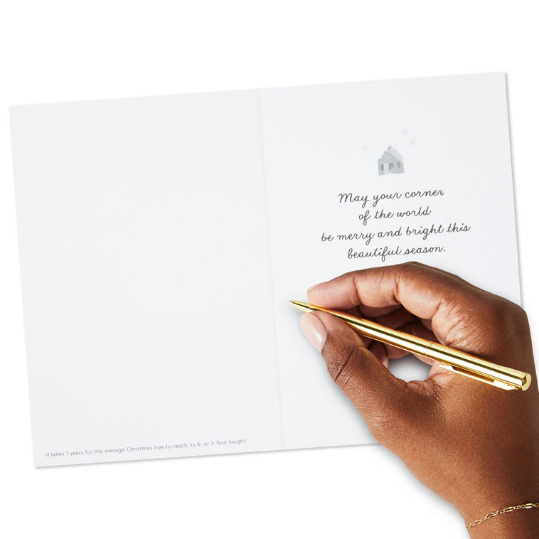 UNICEF boxed Christmas cards feature a cheerful winter scene of whimsical houses, cars and evergreen trees scattered across a snowy hill. Die-cut attachments add a dimensional touch while gold foil lettering brings a subtle shimmer. With an uplifting holiday message, these greetings are a delightful way to share joy and warmth with family, friends, neighbors, teachers, coworkers and more. Includes 12 cards and envelopes.