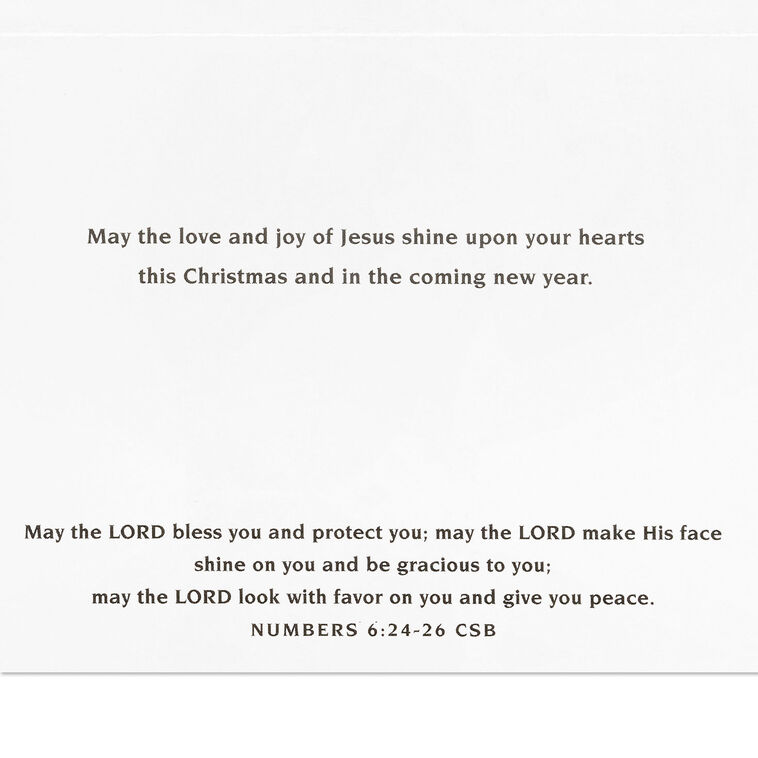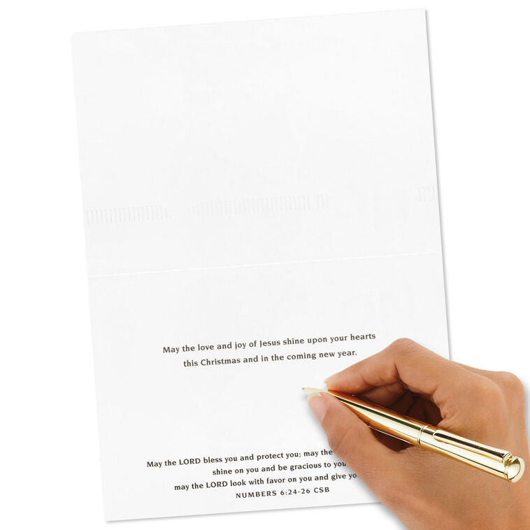 Religious boxed Christmas cards feature a snowy country church scene by Thomas Kinkade Studios with glitter and shiny gold foil accents. DaySpring cards include a Bible verse from Numbers, and coordinating designed envelopes lend the perfect finishing touch. This multipack of holiday cards is perfect for sending season's greetings to friends, family and loved ones. Includes 16 cards and 16 designed, self-sealing envelopes.