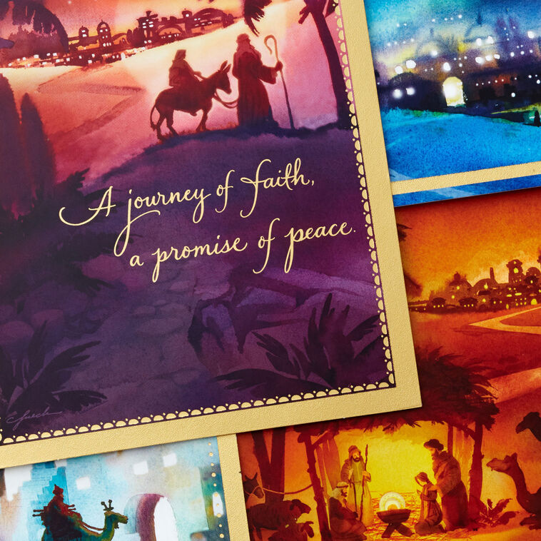 Boxed Christmas card assortment features four coordinating faith-filled designs in rich, colorful tones and gold foil accents: Bethlehem scene on blue, nativity scene on gold, traveling wise men on green and journey to Bethlehem on burgundy. This multipack of holiday cards is perfect for sending merry Christmas wishes to friends, family and loved ones. Includes 40 cards and 40 envelopes: 10 each of 4 designs.