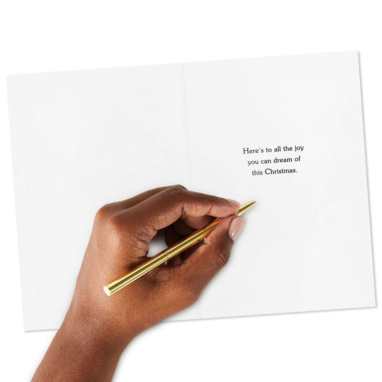 Boxed Christmas cards feature a nostalgic illustration of a snowy outdoor scene with Santa Claus waving cheerfully, a pack of gifts slung over his back. A pale blue background and red foil lettering pair with a heartwarming message to create a sense of holiday joy. This bulk pack makes a great way to share season's greetings to friends, family and loved ones near and far. Includes 40 cards and envelopes.