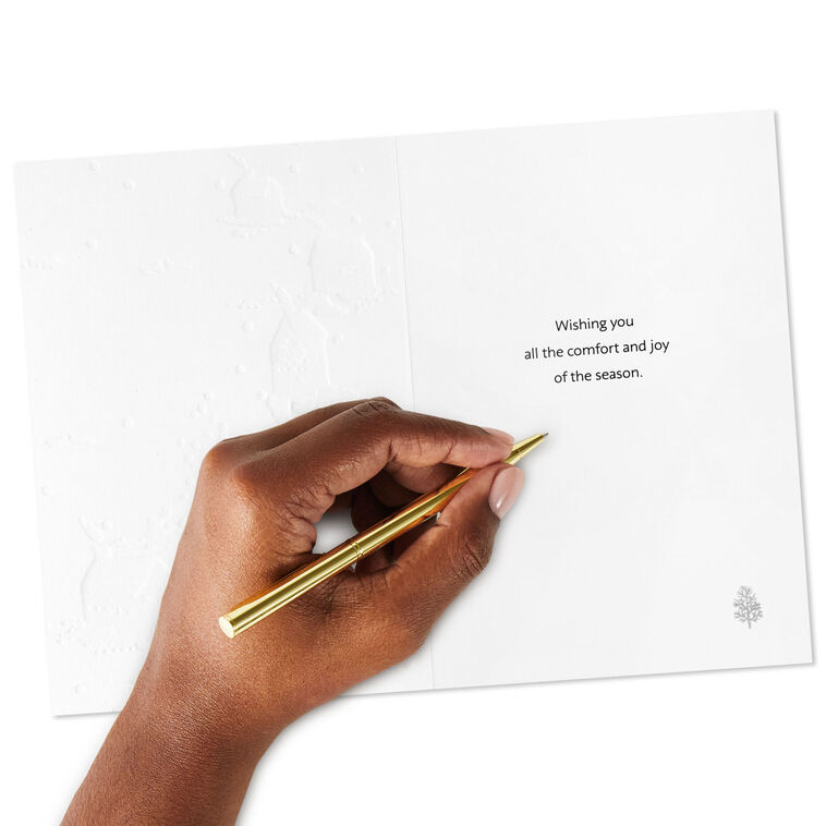Boxed Christmas cards feature an embossed image inspired by needlepoint art depicting rustic homes along a pebbled path. Embroidered trees and houses, French knots and cross-stitch lettering are paired with a message of good cheer. Handcrafted-style holiday greetings make a charming choice for friends, family, coworkers, neighbors and loved ones near and far. Includes 16 cards and envelopes.