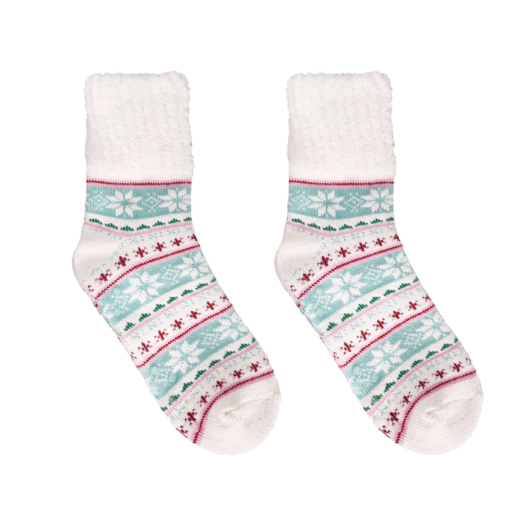 Assorted fuzzy socks in pink, teal, and neutral tones with cocoa mugs and snowflake patterns.