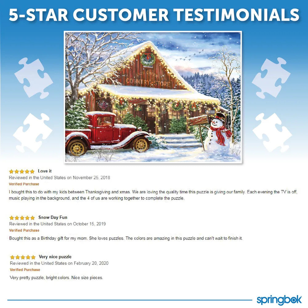 Go find your perfect Christmas tree at Lazy Creek Country Store. This 1000-piece jigsaw puzzle is the perfect Christmas puzzles, featuring a wonderful illustration of a vintage country store complete with wreaths and a snowman out front.